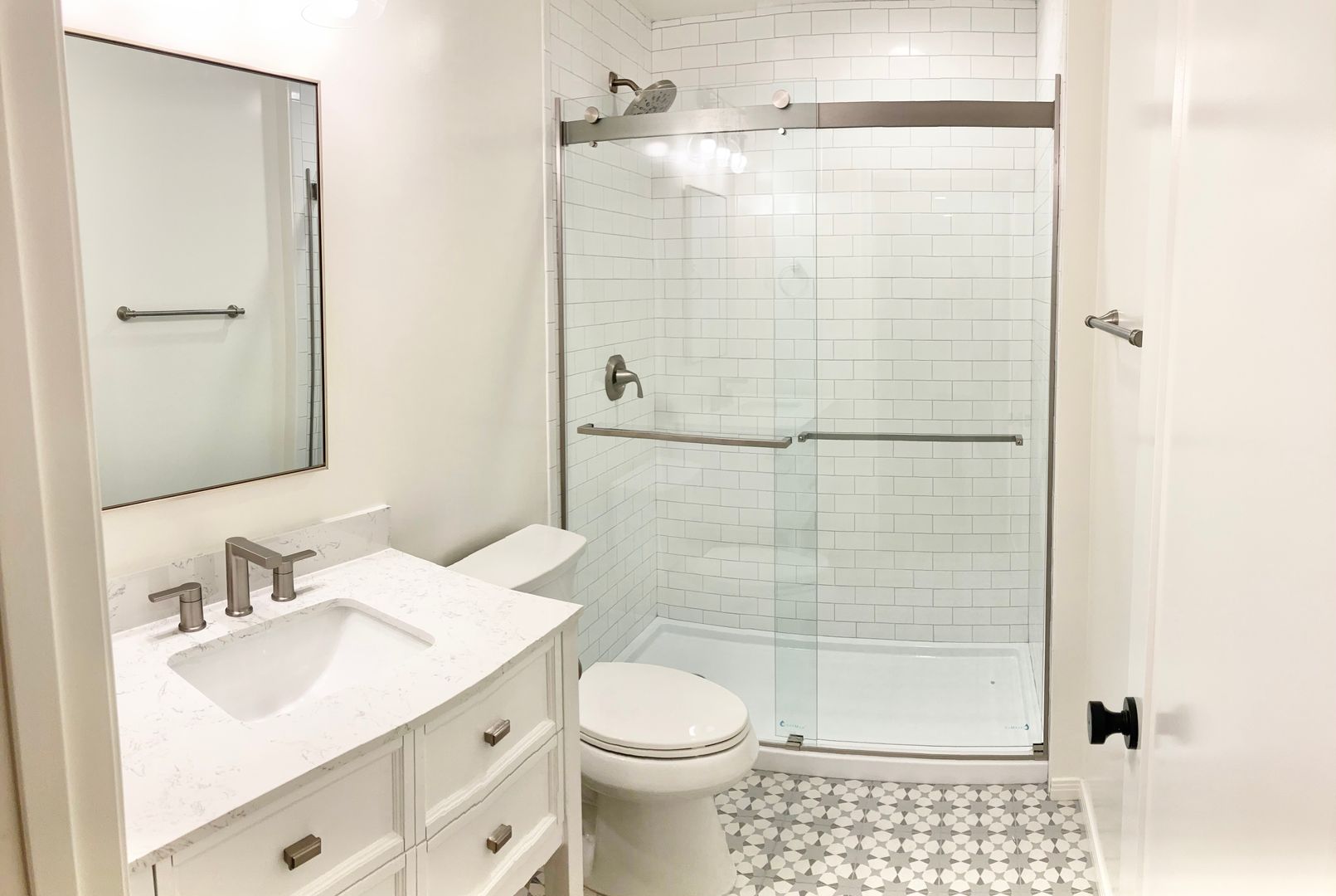 Luxury Bathroom - Custom Double Vanity with ample storage, Glass Enclosed Subway Tile Shower, Kohler Toilet with Soft Close Lid, Custom Faucet, Window in Shower