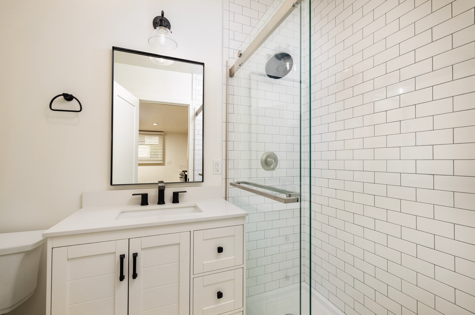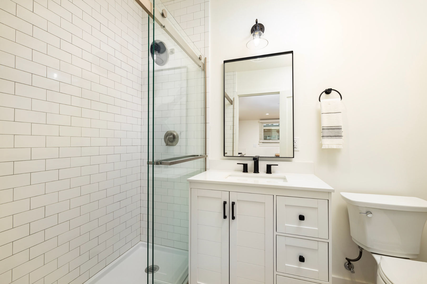 - Custom Vanity with Storage, Glass Enclosed Subway Tile Shower, Kohler Toilet