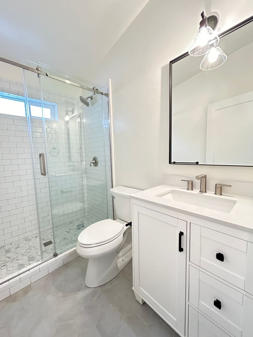 Luxury Bathroom - Custom Vanity with Storage, Glass Enclosed Subway Tile Shower, Kohler Toilet with Soft
