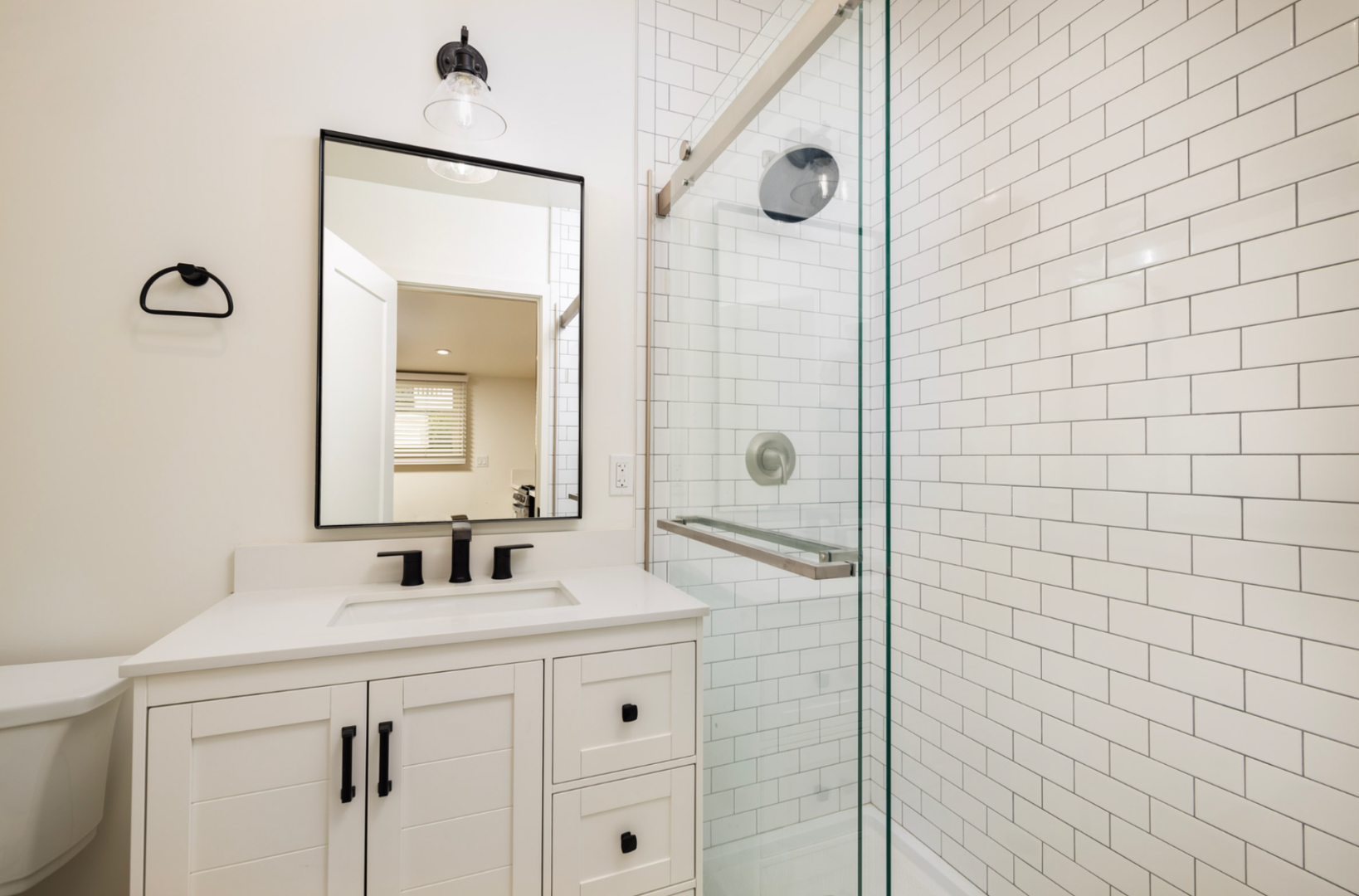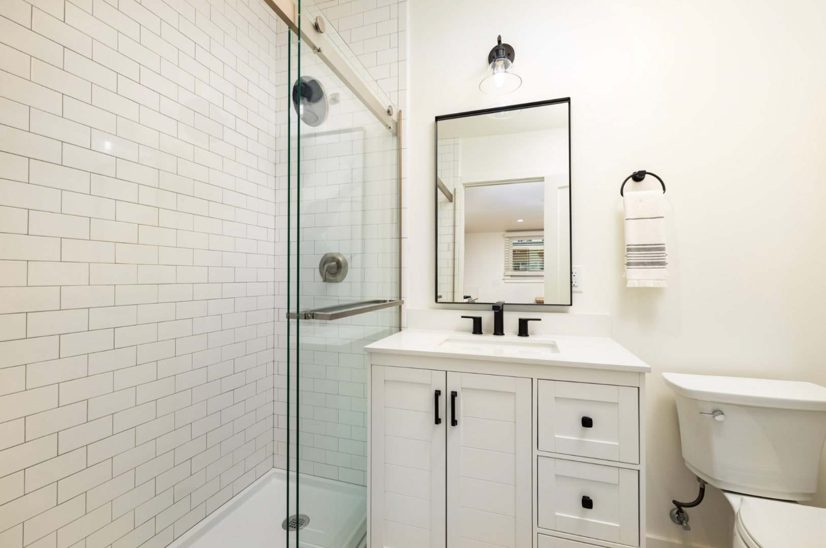 - Custom Vanity with Storage, Glass Enclosed Subway Tile Shower, Kohler Toilet
