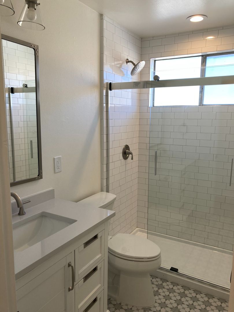 Luxury Bathroom - Custom Vanity with Storage, Glass Enclosed Subway Tile Shower, Kohler Toilet with Soft
