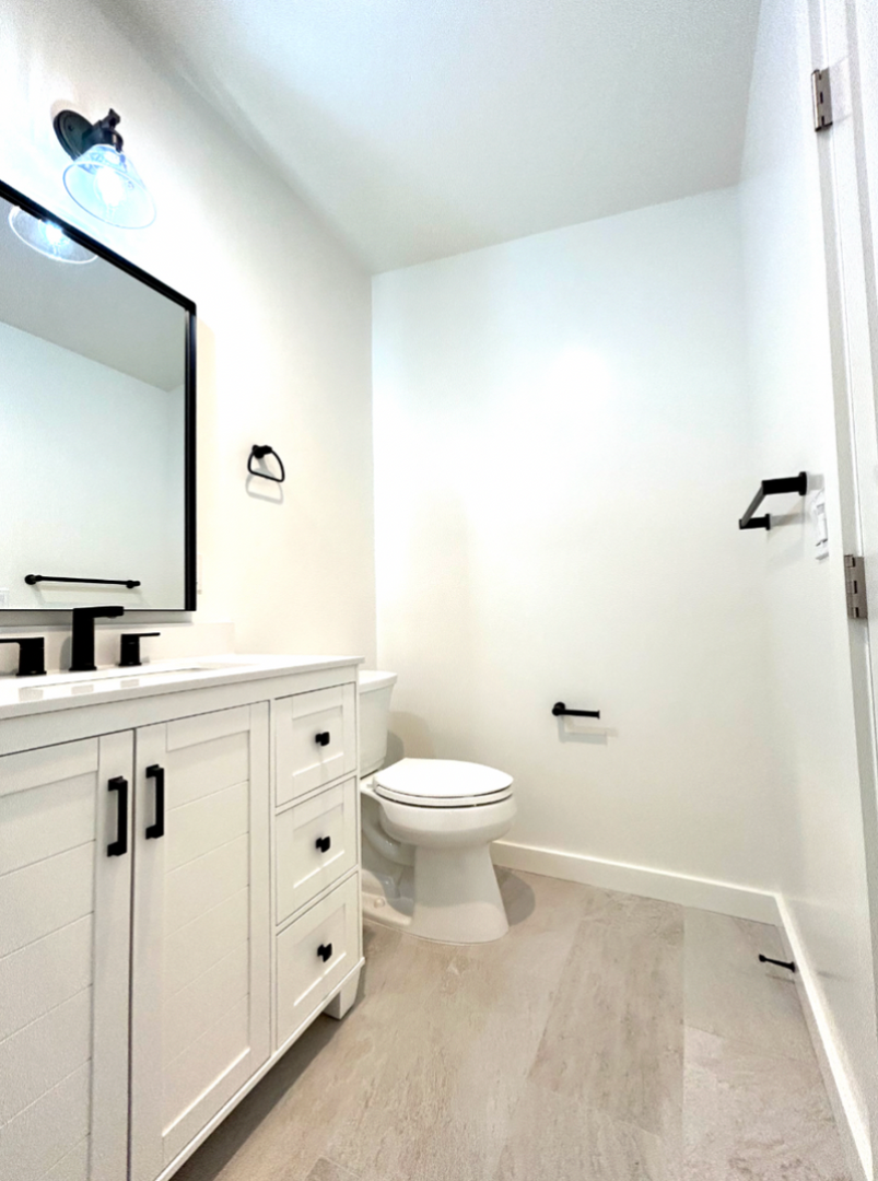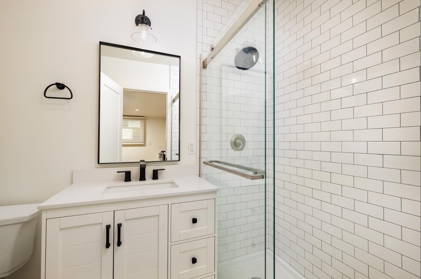 - Custom Vanity With Storage, Glass Enclosed Subway Tile Shower, Kohler Toilet With Soft Close Lid, Custom Faucet, Humidifier Controlled Fan