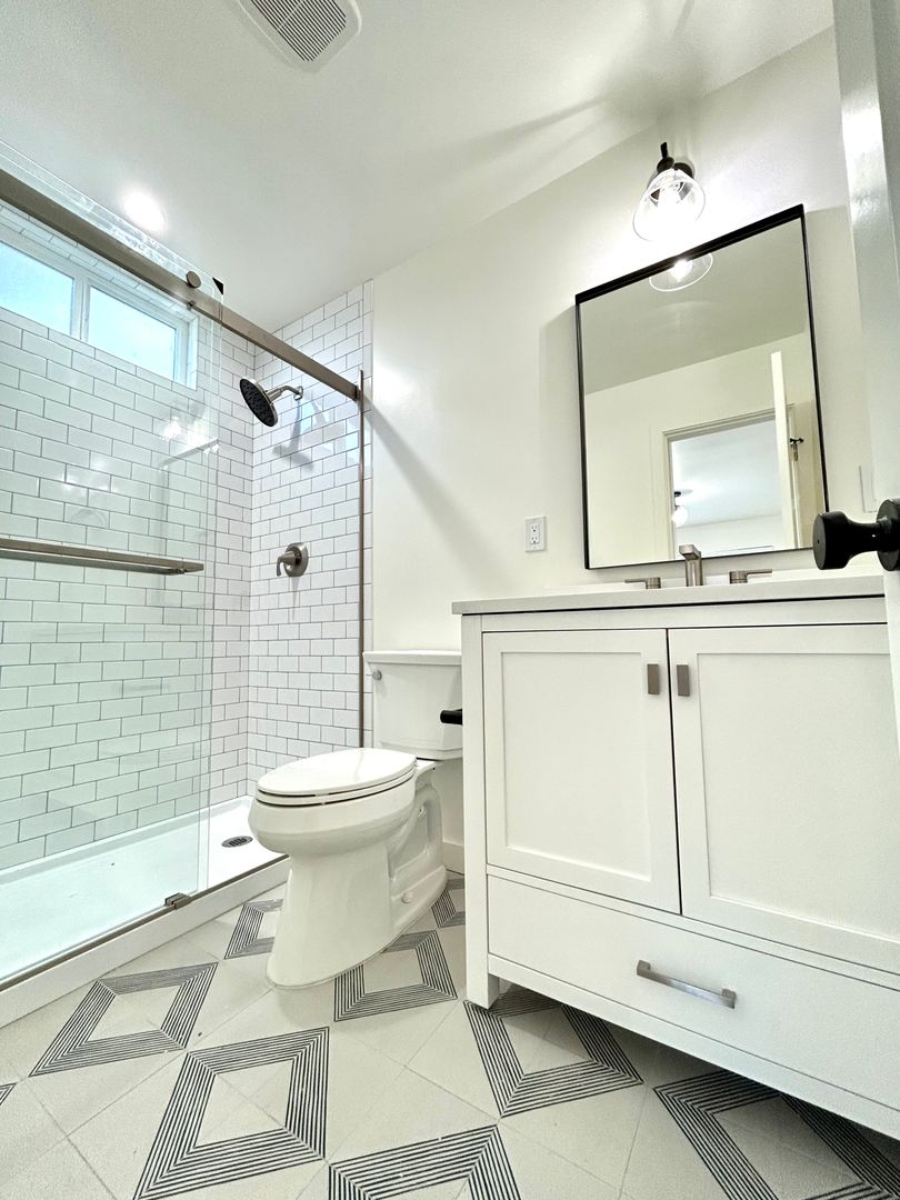 - Luxury Bathroom - Custom Vanity With Storage, Glass Enclosed Subway Tile Shower, Kohler Toilet With Soft Close Lid, Custom Faucet, Humidifier Controlled Fan