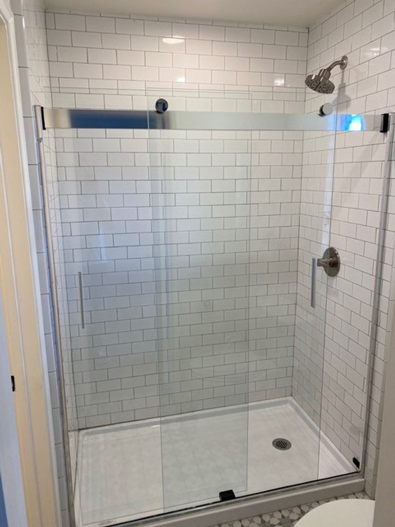 Luxury Bathroom - Custom Double Vanity with ample storage, Glass Enclosed Subway Tile Shower, Kohler Toilet with Soft Close Lid, Custom Faucet, Window in Shower